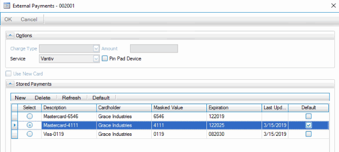 Note: You cannot add, edit, or delete external CC payment information in the detail grid. You must use the Payments button on the toolbar to open the External Payments screen to perform these actions. However, if you have an EMV (card reader) device available, you can use it to enter a new card when the Use New Card check box is marked.