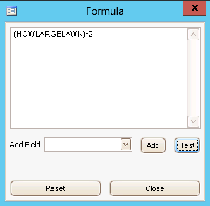 When the formula work area opens, use the Add Field drop-down list to select the predefined fields to use in your formula. When complete, click on the Test button to test the formula. The system will tell you if the formula is valid or not. Note, however, that the system does not know if the formula is technically correct.
