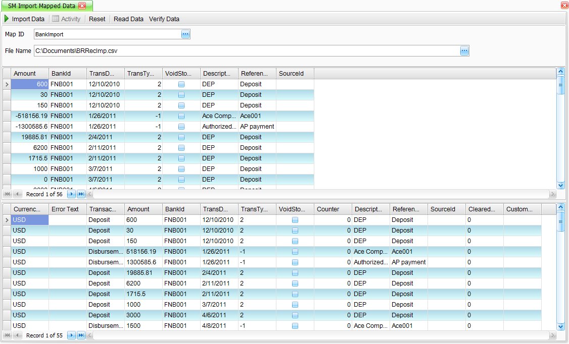 Use the Import Mapped Data utility to verify ASCII files before importing them into GL Transactions, BR Cleared Transactions, and IN Physical Counts Entry using the Import button on the toolbar.