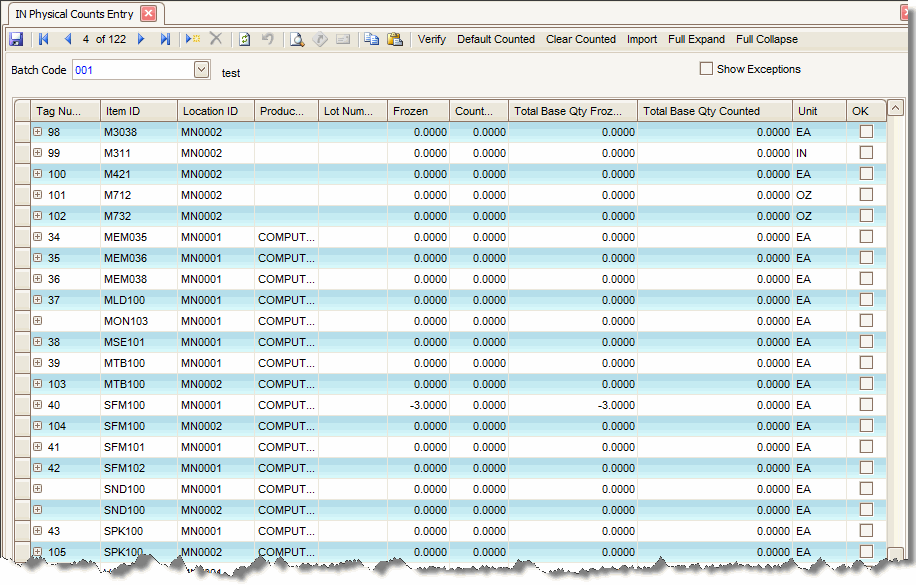 | Full Expand | Will expand all tag and lot number records. You can also expand these records by clicking on the + next to the Tag Number. This allows you to enter counts for individual bins. |