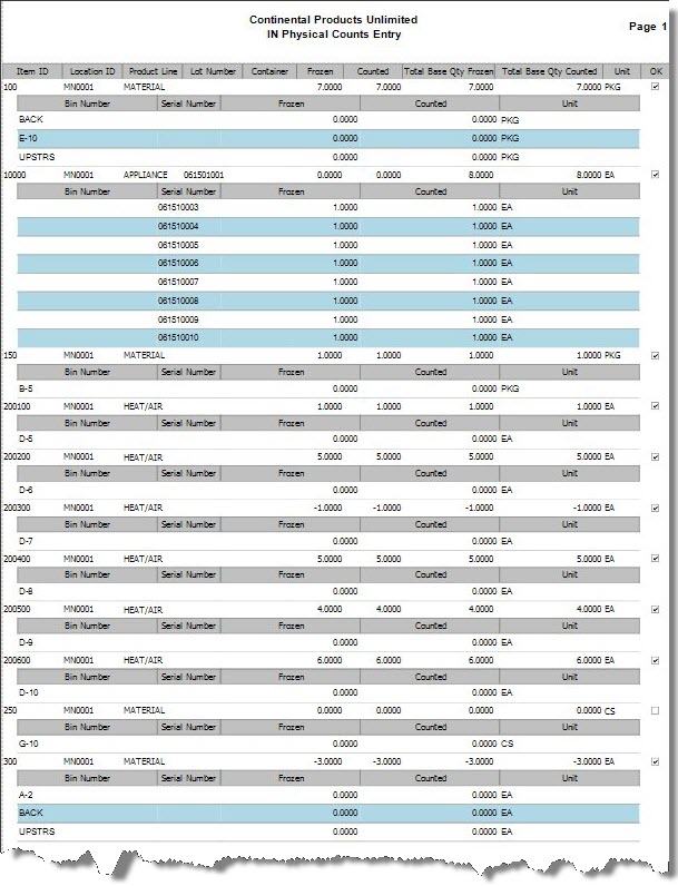 After you enter physical counts, produce a list of quantities from selected batches to verify that the correct quantities are entered.