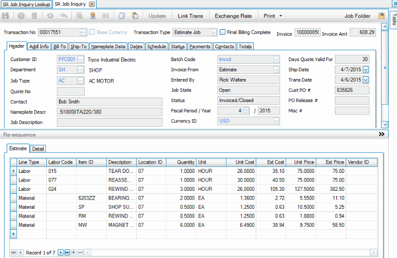 To view details for a job, select the transaction to view from the Transaction No drop-down list. The Job Inquiry screen will display the details for the job.