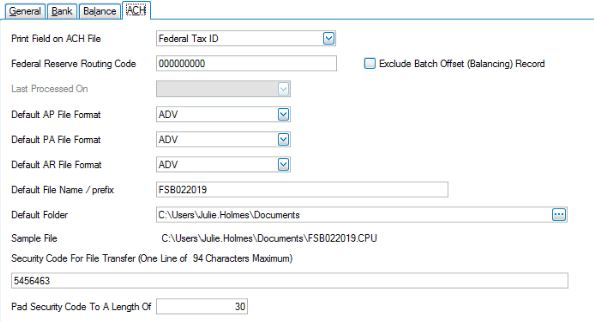 - Enter the Security Code For File Transfer if your bank expects your ACH file to begin with one. If you bank does not require a security code, leave this field blank.