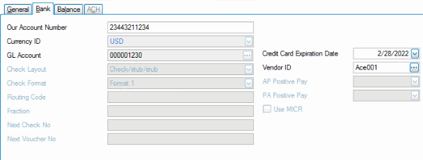 When a bank is set up as a Credit Card type bank you will have the ability to enter the credit card number used for this bank, the expiration date of the credit card and the vendor ID to use when paying open invoices using the credit card bank.