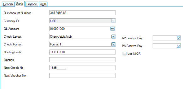 When a bank is set up as a General type bank, you will have the ability to enter a routing code, use MICR printing on checks, enter the fraction printed on checks, and select a positive pay setup for both AP and Payroll.