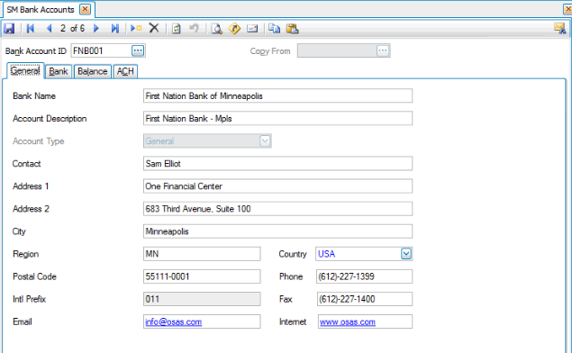 - Enter the bank's Phone, Fax, Email, and Internet information, including the International Prefix.
