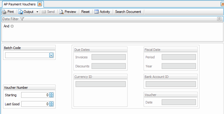 Note: The Due Dates, Currency ID, Fiscal Date, Bank Account ID, and Voucher sections display the appropriate information. - Enter the first voucher number, or accept the default voucher number, in the Starting field.