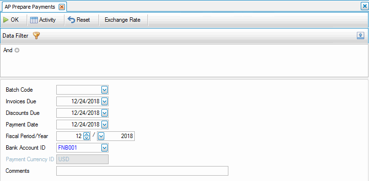 Note: If you use multicurrency and you selected a foreign currency for which to prepare payments, the currency assigned to the bank account you select appears in the Payment Currency ID field. - The Exchange Rate button on the toolbar will open the Exchange Rate dialog box where you can view all possible combinations of active currencies, and edit exchange rate values if applicable.