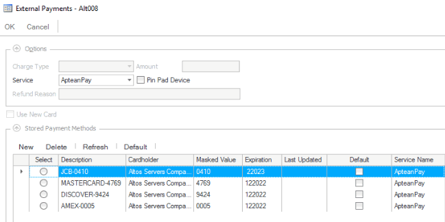 Note: You cannot add, edit, or delete external CC payment information in the detail grid. You must use the Payments button on the toolbar to open the External Payments screen to perform these actions. However, if you have an EMV (card reader) device available, you can use it to enter a new card when the Use New Card check box is marked.