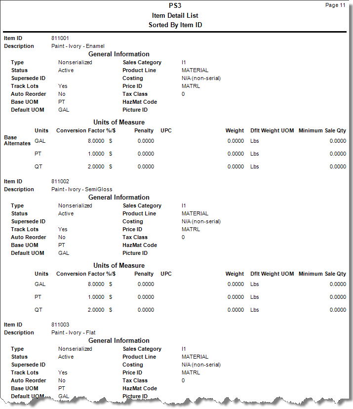 The Item Detail List contains information about your inventory items: general information, alternate items, units of measure, and location summary information.
