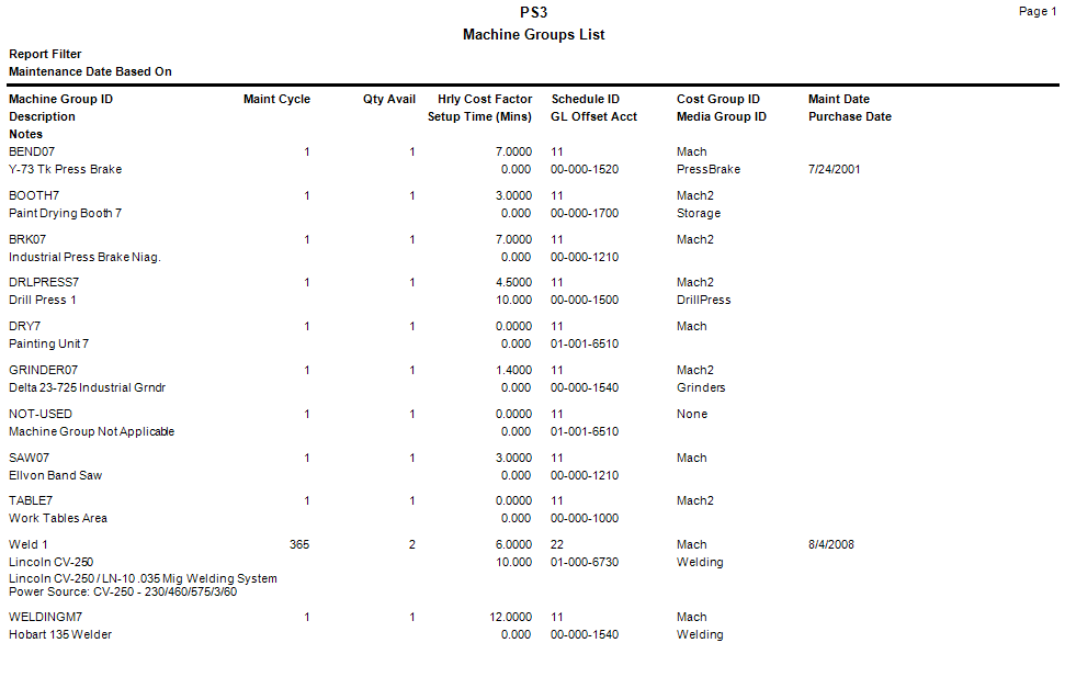 Use this master list to view a list of machine groups, machine group descriptions, maintenance cycles, quantity available, hourly cost factor, and associated GL account, schedule, and cost group.
