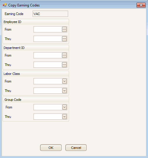 1. Select the range of Employee IDs to copy the selected earning code to. Leave the From and Thru blank to copy the earning code to all employees.
