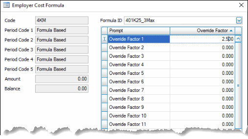 - In the Employer Cost Formula window, select the Formula ID and set Override Factor 1 to the correct percentage for this employee.