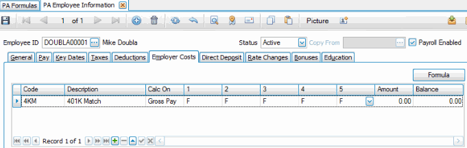 Open the Formulas function from the PA Setup and Maintenance menu to enter the formula for this employer cost.