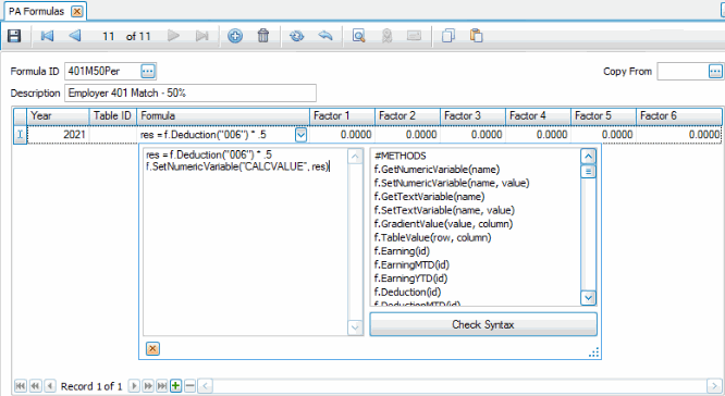- If you are going to be using variable amounts that could change for each employee, use the factor fields and use the (“FCx”) function (x being the value 1 to 6 corresponding to the factor fields).