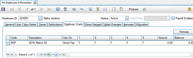 - The Description defaults from the employer cost code. In the 1, 2, 3, 4, and 5 fields, enter an 'F' for Formula in the pay period column you want to have the match calculated. 'N' will default in the other pay period columns. Leave the Amount and Balance fields zero.