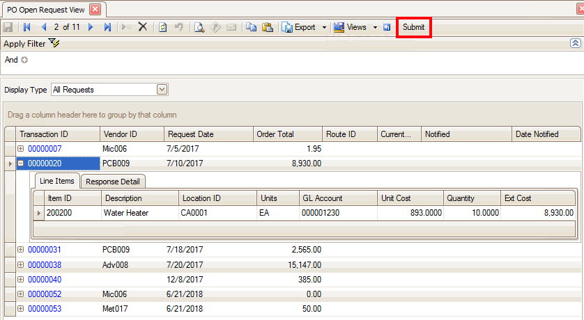 The Order Requests function looks very similar to the PO Transactions function, but there are some key differences: