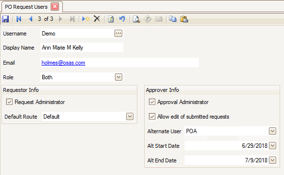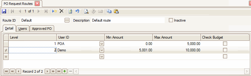 Before you can utilize the PO Approvals process, you need to set up request users and request routes. You can find these functions on the PO Approvals menu.