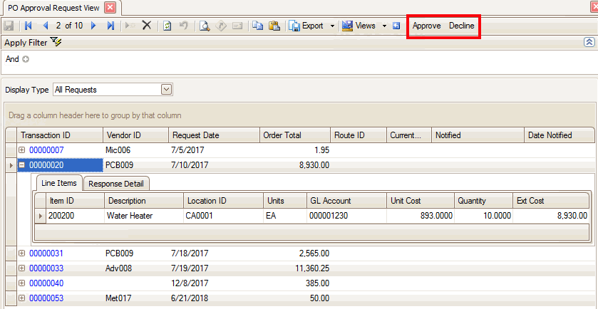 You may also use the Approval Request View to review and approve or decline the order request.