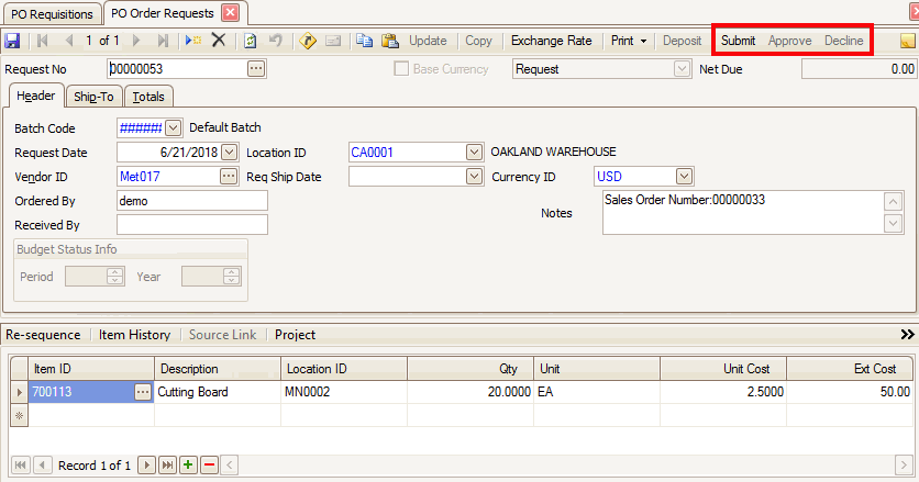 A requester may enter a new Order Request and submit the request for approval. The next approver in line on the route will approve or decline the request, then the next user in line on the route and so on, until the final approver approves the request to become a live Purchase Order. Approving a request will create a live order and update the inventory on‐order quantities.