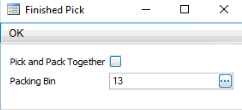 If the Pick and Pack Together check box is clear, the picking and moving actions are finished in one step, and the packing action is a different step. The picked items will be moved to into the selected Packing Bin. You must use the Pack Orders function to complete the packing process.