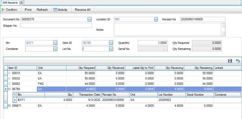Select To Confirm Approve entries and update Inventory item quantities and the transaction status. Print Print receiving labels using the receiving label style specified in the WM business rules, if available. Refresh Refresh the data. Activity Display the Activity Log to view activity. Receive All Automatically receives all listed items to the default receiving bin(s).