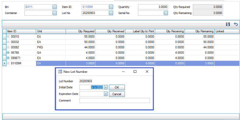- Accept or enter the Quantity of the item you are receiving. The Qty Required and Qty Remaining fields are read-only.