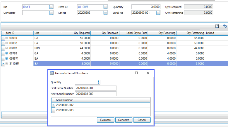 - Enter the Serial No for the item received. If there is more than one serialized item to receive, once you enter a serial number, the Generate Serial Numbers screen will open and suggest the next serial numbers in sequence. Accept or edit the First Serial Number, and use the Evaluate button to see the resulting serial numbers generated. If the serial numbers are acceptable, use the Generate button to create and assign serial numbers to the items you are receiving.