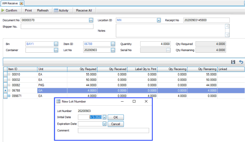 You must confirm the entries you have made before this function will update item quantities in Inventory and transactions in Purchase Order, Sales Order, Project Costing, MFG-Production, Warehouse Management or Shipments. When you click the Confirm button on the Receive screen, WMS updates item quantities and transaction status, as needed.