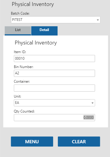 - On the List tab, select the item you are counting. The Detail tab will open and allow you to count the item. Alternately, open the Detail tab and scan or enter the Item ID you are counting.