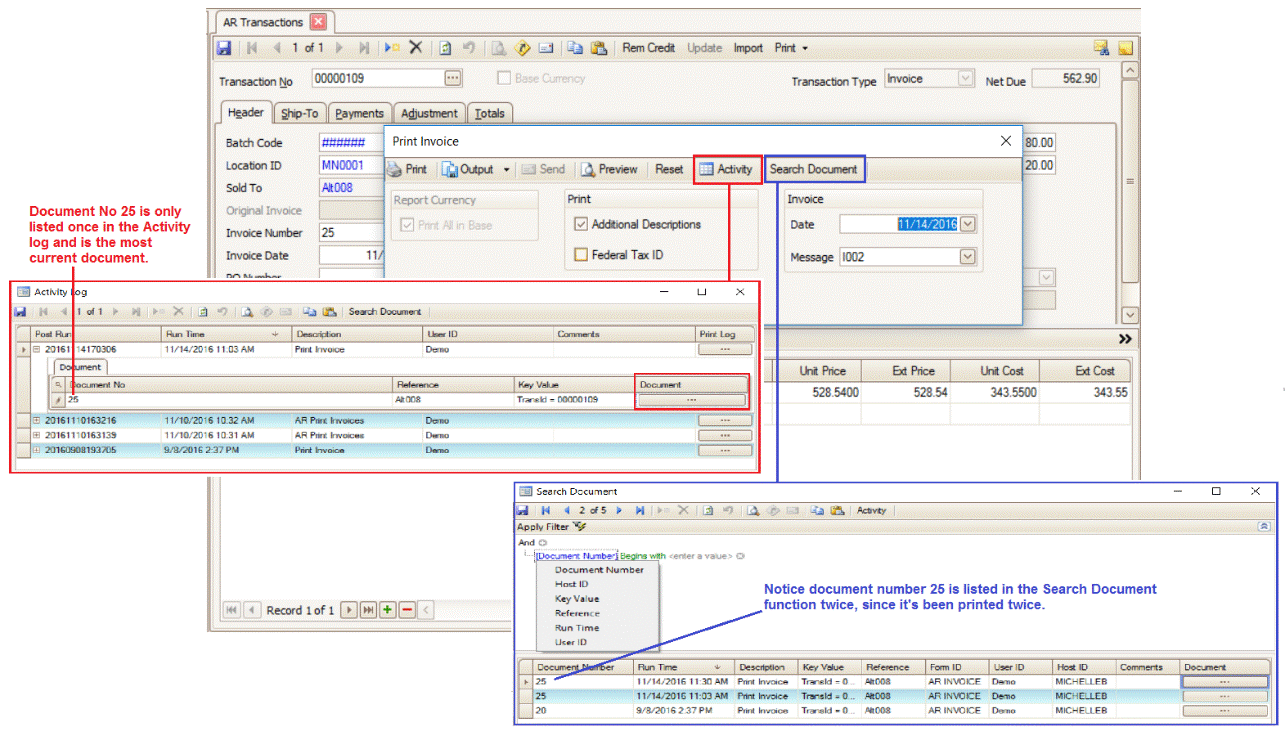 When printing documents from history, you have the option to retrieve archived copies instead of re-rendering from data in history tables. Transactions entered starting in build 16316 will include archived copies, but when they do not exist for transactions entered before this build, documents will be re-rendered using history data.
