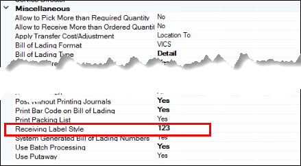 Enter or select a default receiving label style. If the SM Label Provider business rule is set to 'Standard', select a label style you created using the WM Receiving Labels function. If the SM Label Provider business rule is set to a third-party label provider, enter the designation for a label. The label must exist in the location designated by the SM business rule 'Label File Path'.