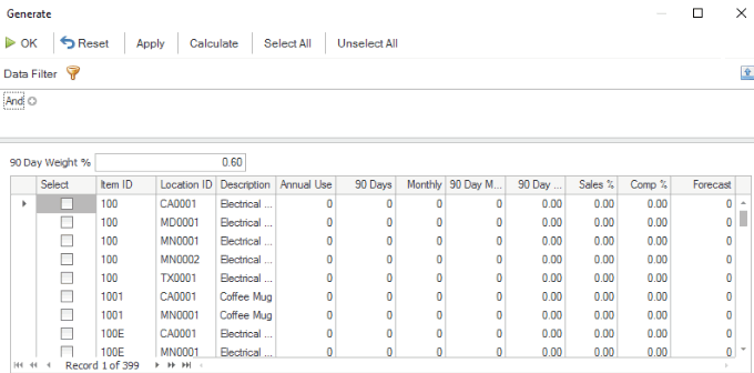 90 Day Weight: Defaults in from the text box. You can edit the 90 Day Weight for individual items, if necessary; you will get a message asking if you want to recalculate the forecast.