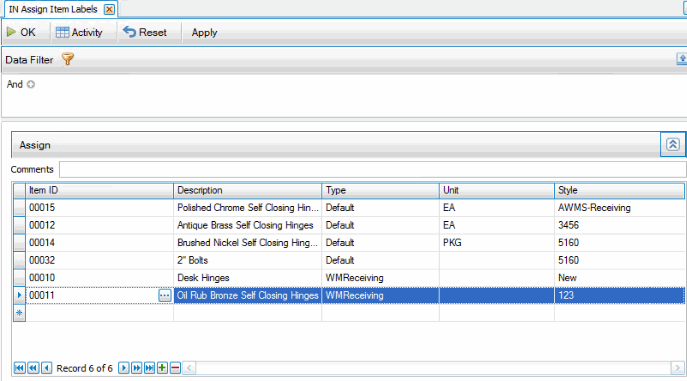 2. Click Apply to see all records in the item label table that match the criteria. The results will populate the data grid.
