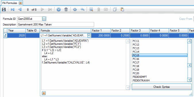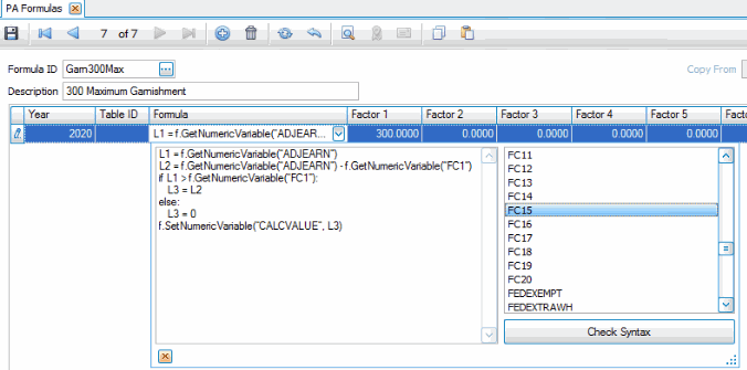 ) to add a new formula for the current payroll year. - To make the formula as flexible as possible, use Factor 1 to store the value of the maximum amount of new pay, 300. Then, if we have more than one employee subject to this type of garnishment or if the maximum net pay for an employee changes, the net pay maximum (Factor 1) can be overridden on an individual employee basis without changing the lines of the formula.