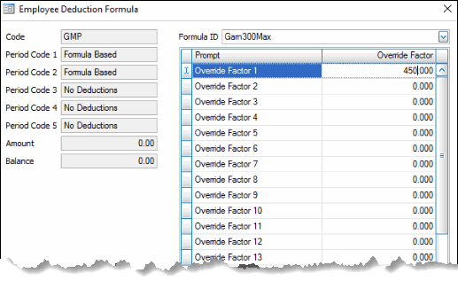 - Enter '450' for Override Factor 1. When this deduction is calculated for Mike Doubla, the formula will use 450 as the value of Override Factor 1. If this garnishment deduction is used for other employees, the value of Factor 1 for the formula is still 300, unless an override factor is enter for that employee.