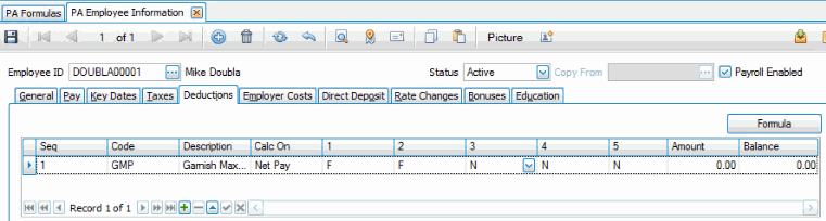 For details on adding the deduction for employees, see this section in the Creating a Maximum Net Pay Garnishment Formula section.