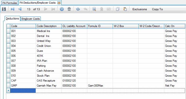 - To add this deduction to the Payroll system, use the Deduction/Employer Costs function on the Codes Maintenance menu. For details on setting up the deduction for employees, see the Creating a Maximum Net Pay Garnishment Formula section.