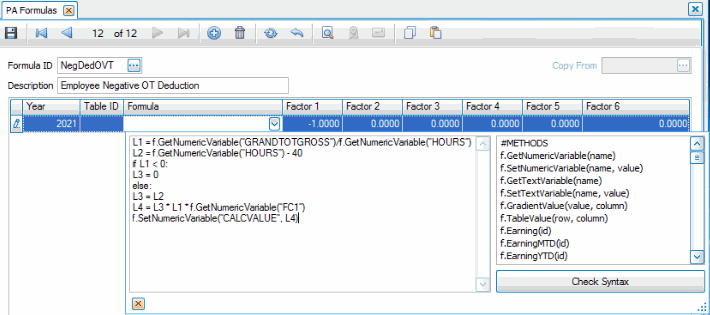 ) to add a new formula for the current payroll year. - Enter '-1.0000' into Factor 1 and '12.00' for Factor 2. Skip the remaining Factors. Factor 2 will be the employee's hourly wage.