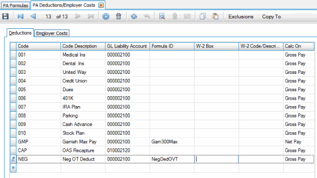 - Set up the employer cost using the Deduction/Employer Costs function on the Codes Maintenance menu.