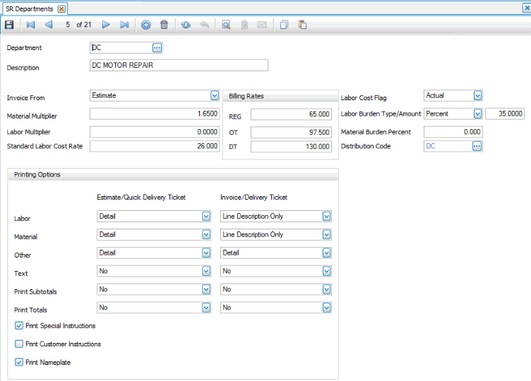 Use the Departments function to set up and maintain information for departments of your company. Information in the department record determines the information that prints on invoices, the material and labor multiplier used to calculate amounts, the standard labor cost rate, labor and material burdens, distribution code, and billing rates.