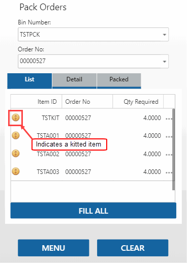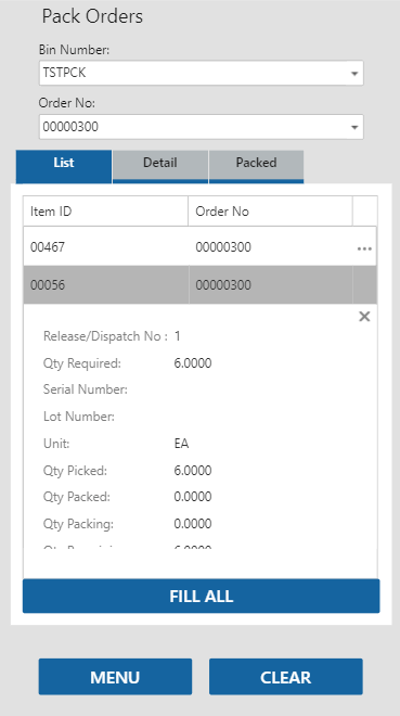 After you finish picking items for an order, use the Pack function to apply the items to orders. This function is equivalent to the Traverse WM Pack Orders function.