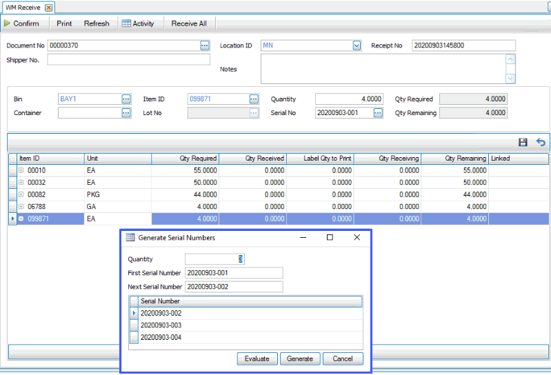 - Enter the Serial No for the item received. If there is more than one serialized item to receive, once you enter a serial number, the Generate Serial Numbers screen will open and suggest the next serial numbers in sequence. Accept or edit the First Serial Number, and use the Evaluate button to see the resulting serial numbers generated. If the serial numbers are acceptable, use the Generate button to create and assign serial numbers to the items you are receiving.