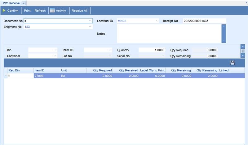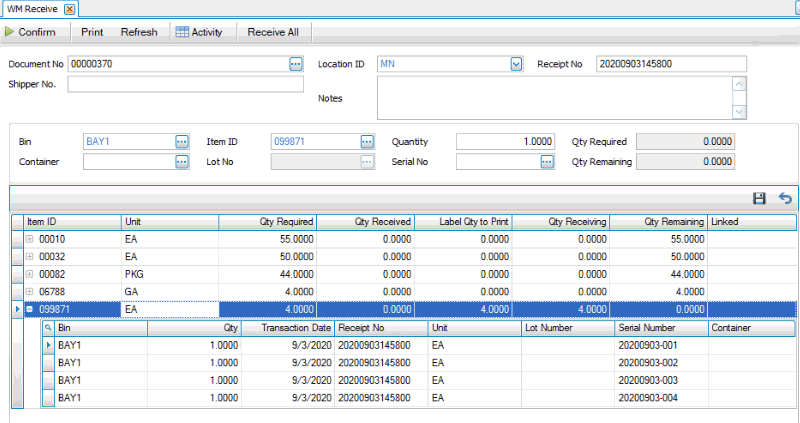 You must confirm the entries you have made before this function will update item quantities in Inventory and transactions in Purchase Order, Sales Order, Project Costing, MFG-Production, Warehouse Management or Shipments. When you click the Confirm button on the Receive screen, WMS updates item quantities and transaction status, as needed.