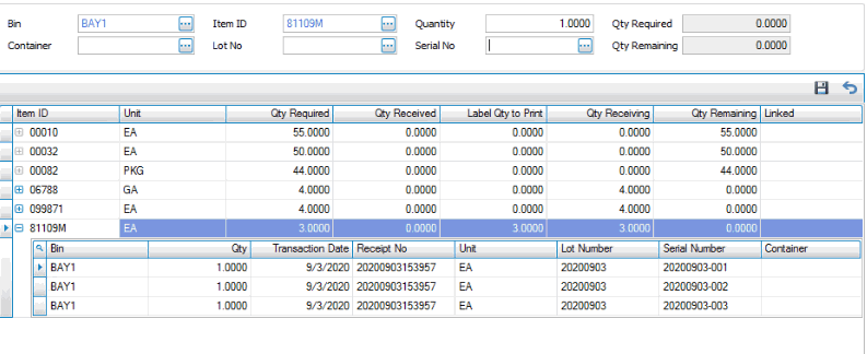 - If you are receive more than a quantity of 1 serialized item, the serial numbers will appear in a child grid of the item. If you are receiving the items singly, click Save after each item. The serial number(s) appear in a child grid of the item.