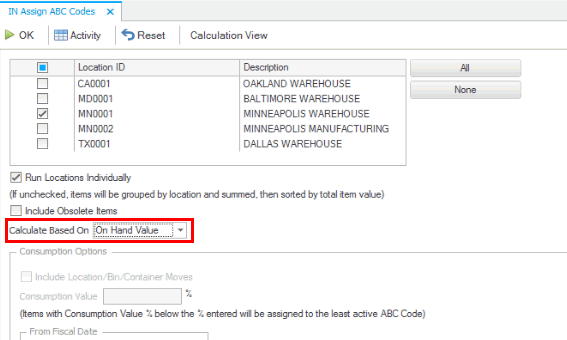 When you enter a Consumption Value percentage, all items with a total value percentage less than the consumption value percentage are assigned to the least-active ABC code.