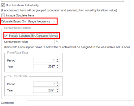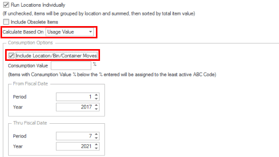 We are assigning ABC codes calculated based on 'Usage Value' with a time frame selected. Usage indicates consumption. and looks at transaction history within the specified period of time. The transaction types considered for consumption include Material Requisitions, MP Build Component, AR Invoice, SO Verify, SO Invoice, IN Verify, IN Invoice Sale, BM Build Component, BM Unbuild Assembly, WM Material Requisitions. When you include location/bin/container moves, the transaction types also include Transfer From, WM Transfer From, and Move Out.