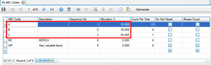 - Sequence No: This indicates the "level" of value to consider when assigning ABC codes. The lower the sequence number, the higher the value and the more often it will be counted. For example, if code A is sequence number 1, and the allocation % of code A is 20%, the items that make up the top 20% of the total value of all items will be assigned code A. If code B is sequence no 2 and the allocation % is 30%, the items that make up the next 30% of total value of all items will be assigned code B. And so on.