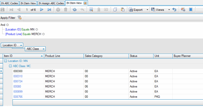 Next, the system assigns codes based on the global settings from the ABC Codes maintenance screen. According to the global settings, any item with a product line = 'MERCH' should be assigned to the 'MC' ABC code. In our selected location (MN) there are 6 items that belong to the 'MERCH' product line, so those will always be assigned to the 'MC' code.
