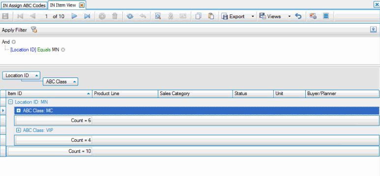 In IN location 'MN', 4 items are assigned to ABC code 'VIP'. There are an additional 6 items that are assigned to the 'MERCH' product line.